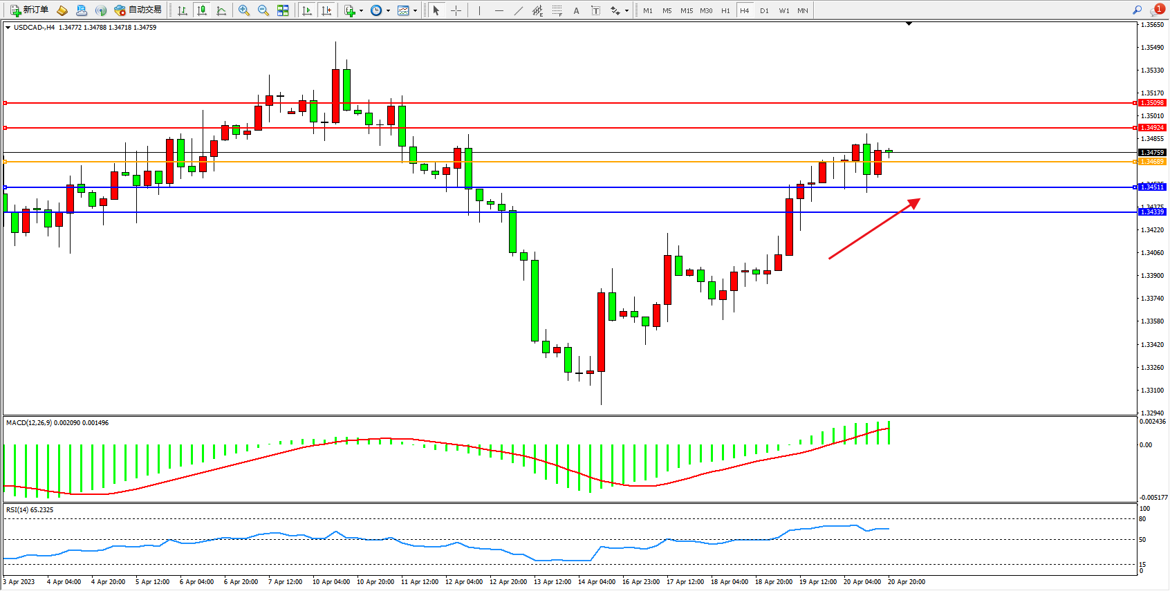 4小时图看:多头动力维持震荡上扬,短期看涨情绪逐渐增加,MACD指标处于多头区域高位整理,RSI指标处于多头区域维持整理;
