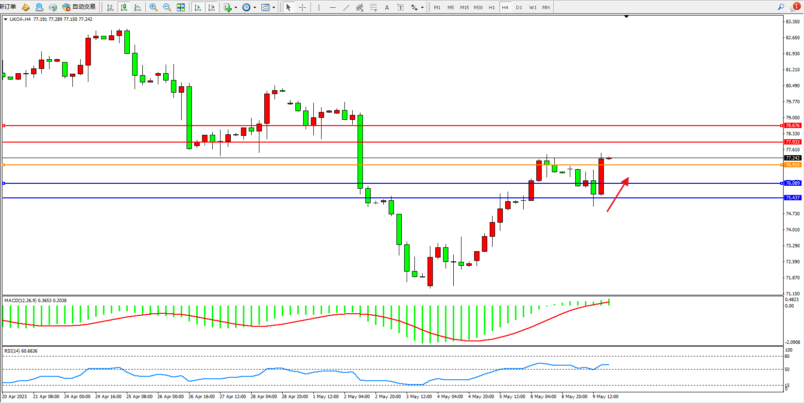 交易策略:76.915上方看涨,目标77.933 78.676