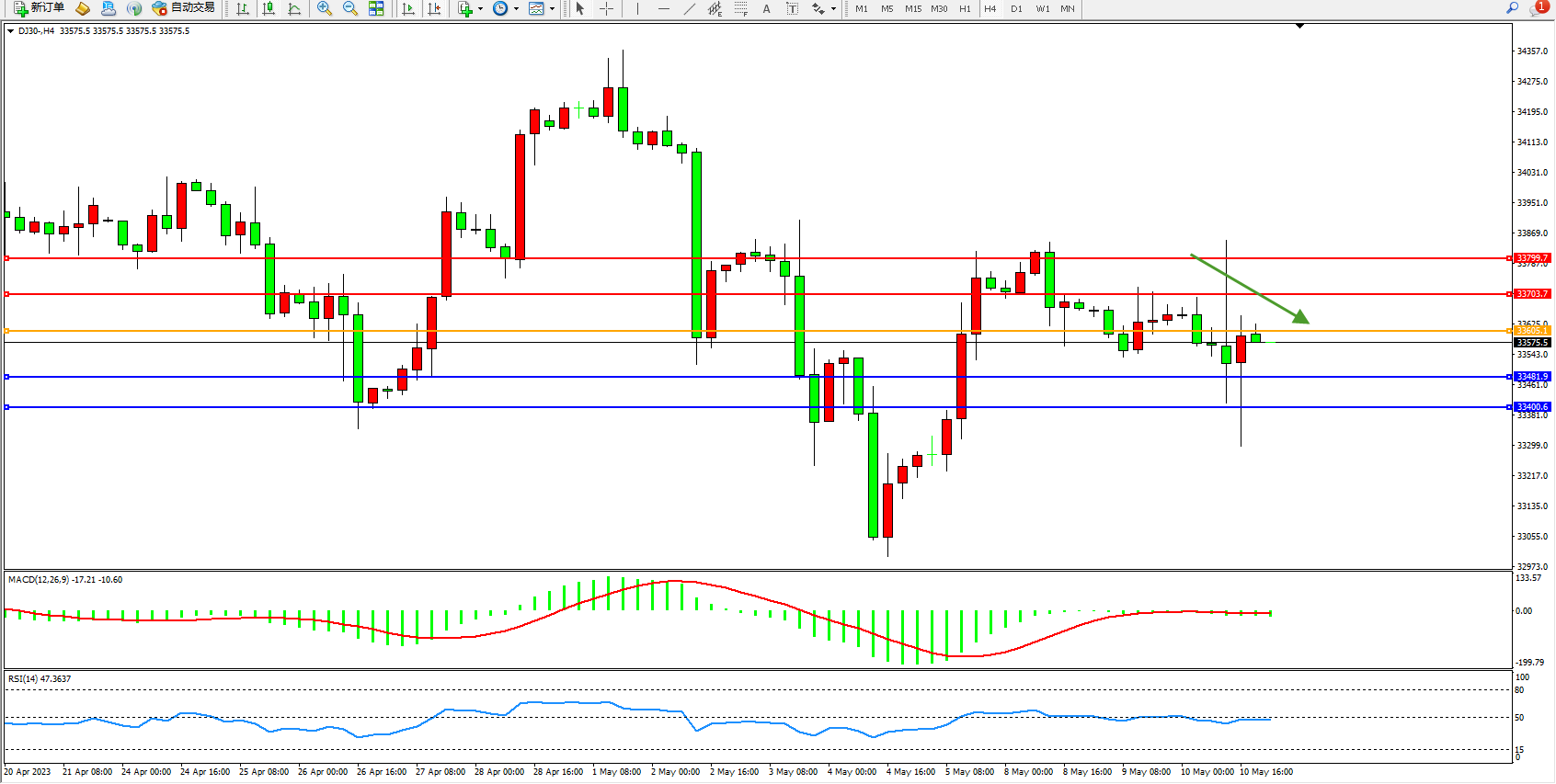 道琼斯指数5月10日(周三)收盘下跌30.81点,跌幅0.09%,报33531.00点;美国4月未季调CPI年率 4.9%,预期5.00%,前值5.00%,连续第10次下降,为2021年4月以来新低,低于市场预期5.0%。
