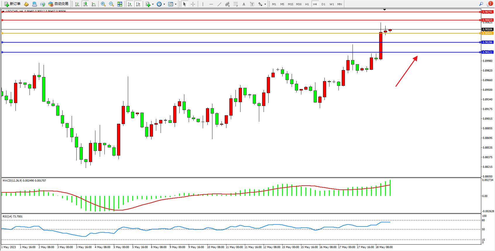 美元兑瑞郎维持0.90506附近震荡,随着美国政治僵局可能拖累全球最大经济体陷入违约,投资者重新把目光投向瑞士法郎,瑞郎常常被视为可替代美元的避险之选,以往美国债务上限问题发作时,它有不俗表现。