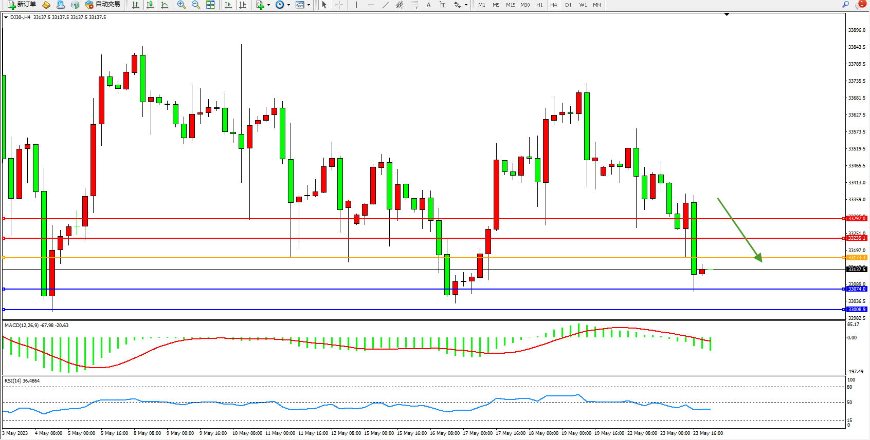 道琼斯指数5月23日(周二)收盘下跌231.01点,跌幅0.69%,报33055.57点;美国通胀将在2023年和2024年持续居高不下。通胀率要到2025年或更晚才能降至美联储的目标水平。美联储加息造成的“过度货币紧缩”,对美国经济构成了最大的威胁。
