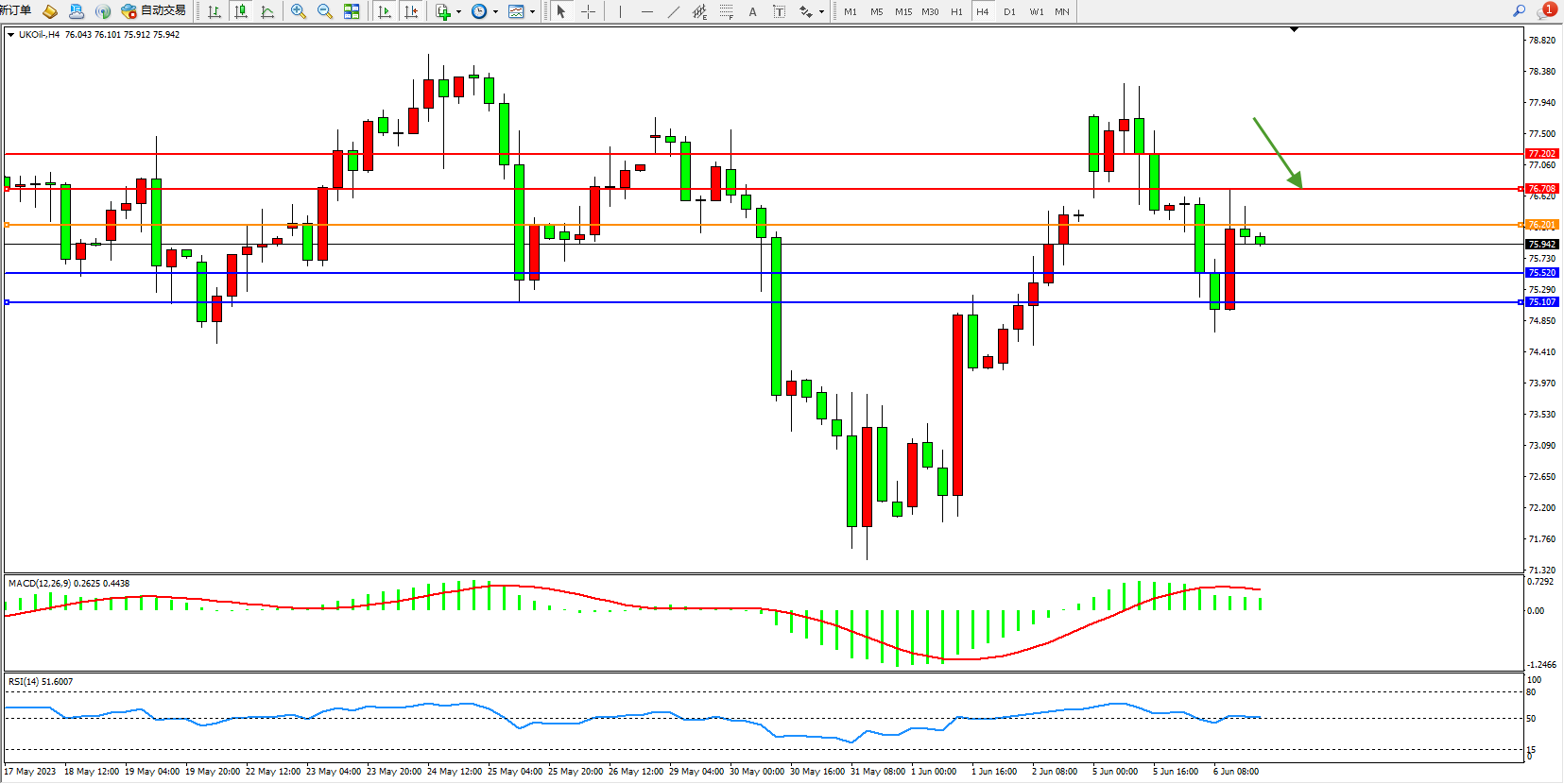 布油维持75.942附近震荡,市场参与者正在观望美联储是否会在6月加息或维持利率不变。全球经济前景的不确定性超过了沙特阿拉伯宣布多年来最大减产时引发的供应担忧。