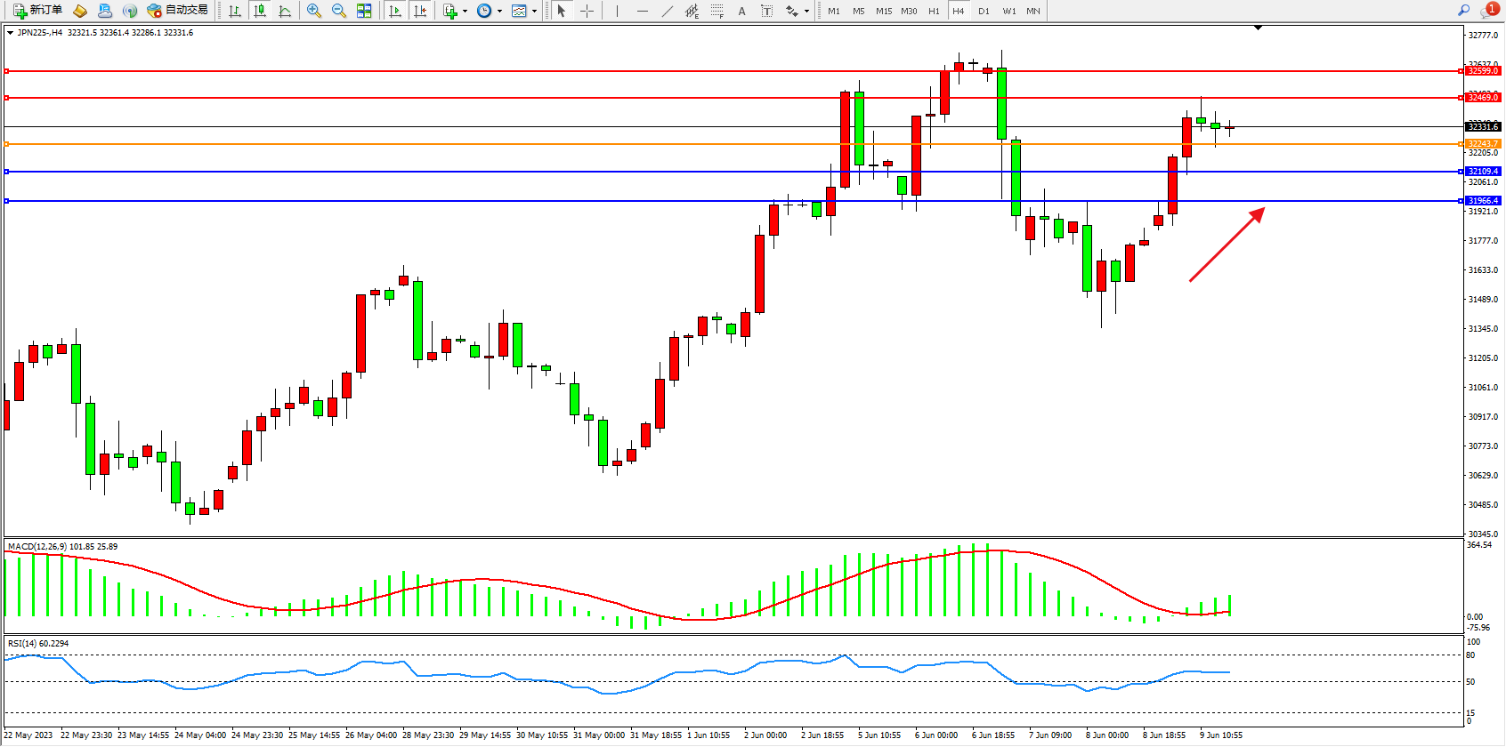 日经225指数6月9日(周五)收盘上涨619.23点,涨幅1.96%,报32260.50点。日经225指数势将完成为期九周的上涨,或创逾五年以来时间最长上涨纪录。自6月2日以来,该指数上涨了近2%,将4月7日以来的涨幅扩大至17%。据交易所数据,外国投资者在5月份共购买了2.4万亿日元(172亿美元)日本股票,达2013年4月以来最高水平。