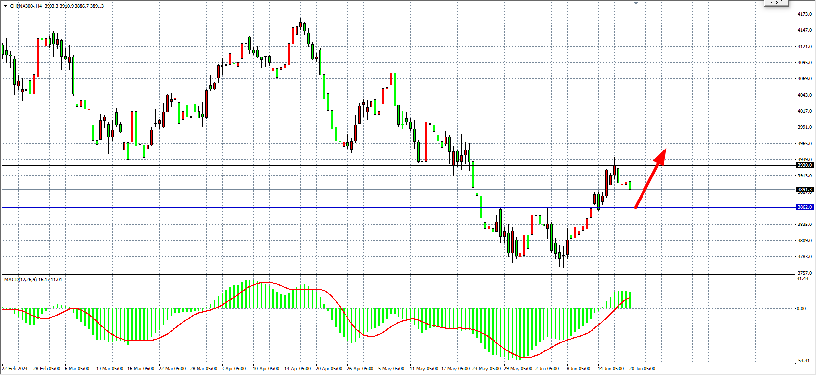 4小时图看,沪深300在3930下小幅下跌,MACD量能在零轴上维持放量,行情进入回调,支撑关注3860附近,上方阻力3930附近。