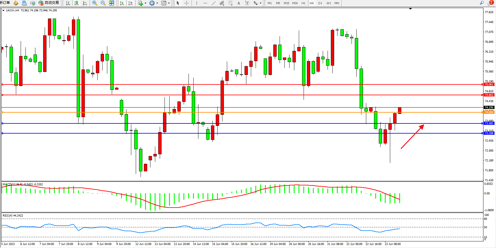 交易策略:74.004上方看涨,目标74.663  75.061
