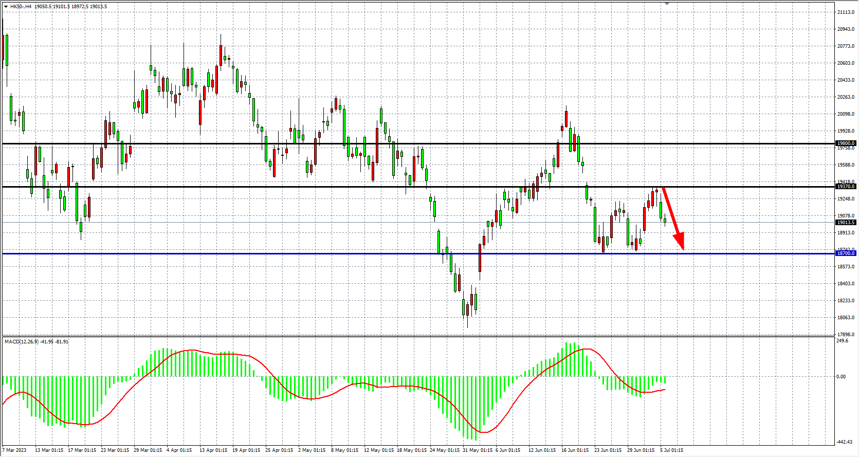 4小时图看,恒指回落19000关口,MACD量能维持零轴下,趋势反弹动能减弱,后市或进入宽幅震荡,在19370之下继续看回调。