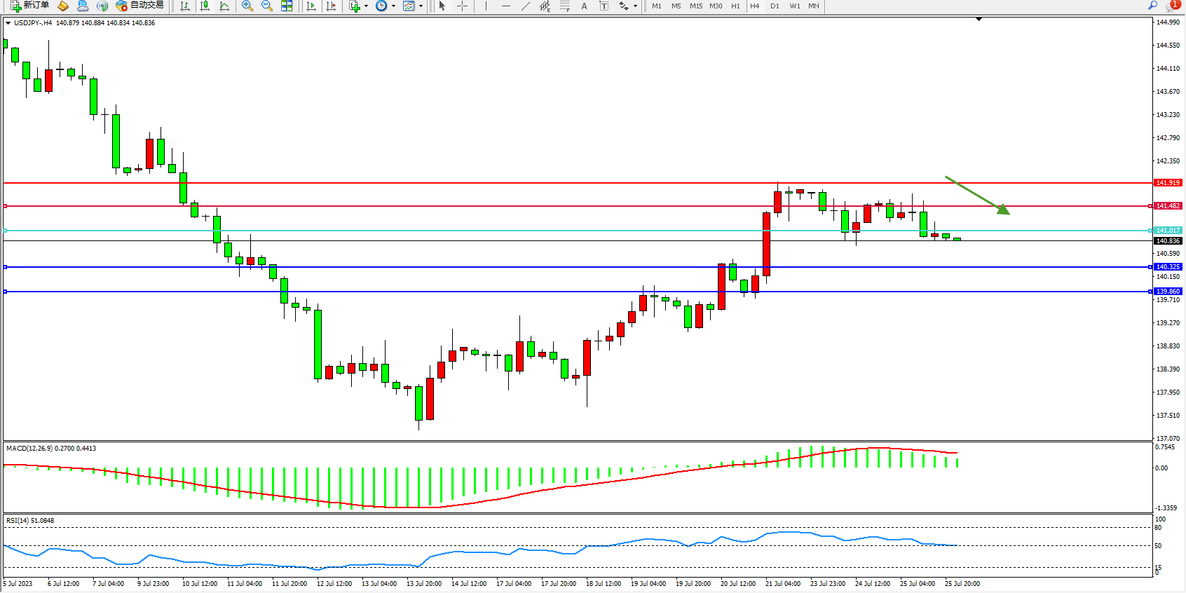 4小时图看:空头动力维持窄幅整理缓慢下行,短期跌势或将延续,市场整体偏空头走势中,MACD指标处于多头区域缓慢下移,RSI指标处于50均衡线附近弱势徘徊;