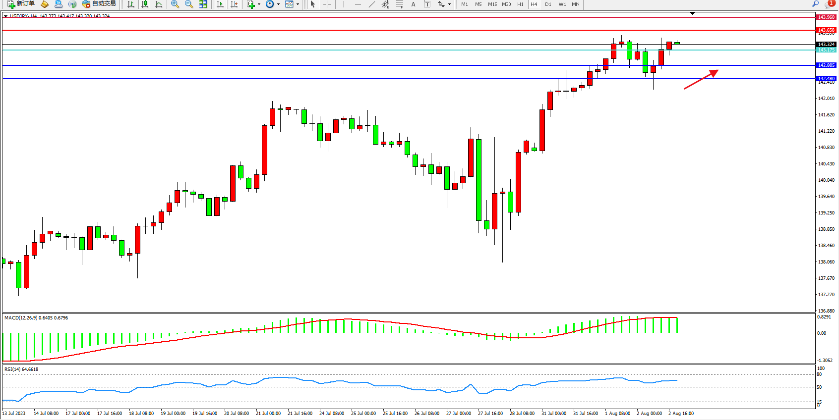 交易策略:143.175上方看涨,目标143.658  143.960