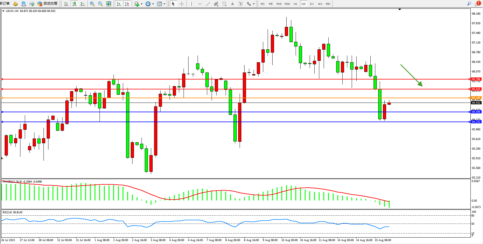 4小时图看:空头动力持续震荡下行,短期跌势持续,市场空头情绪笼罩,MACD指标处于空头区域维持整理,RSI指标处于空头区域徘徊;