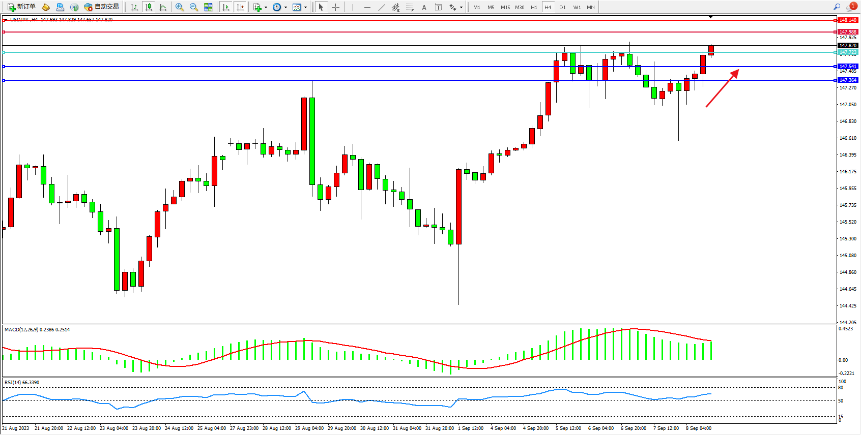 交易策略:147.723上方看涨,目标147.988 148.140