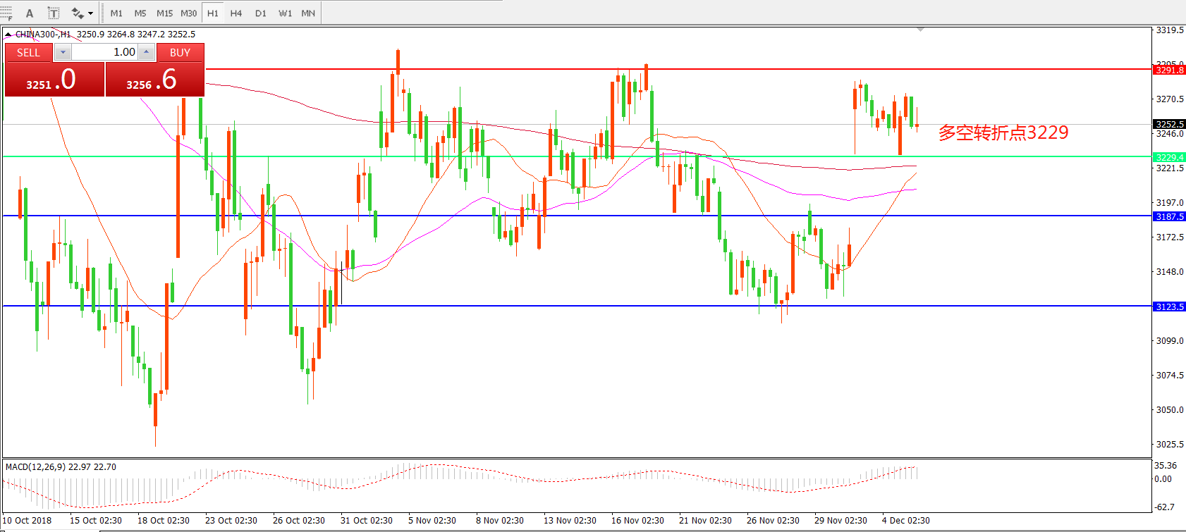 1小时图看,CHINA300中华指数跳空高开后站稳3229一线震荡,但整体位于多空转折点之上,长期均线逐渐走平,短期21周期均线有拐头迹象,日内依然以箱体震荡为主。