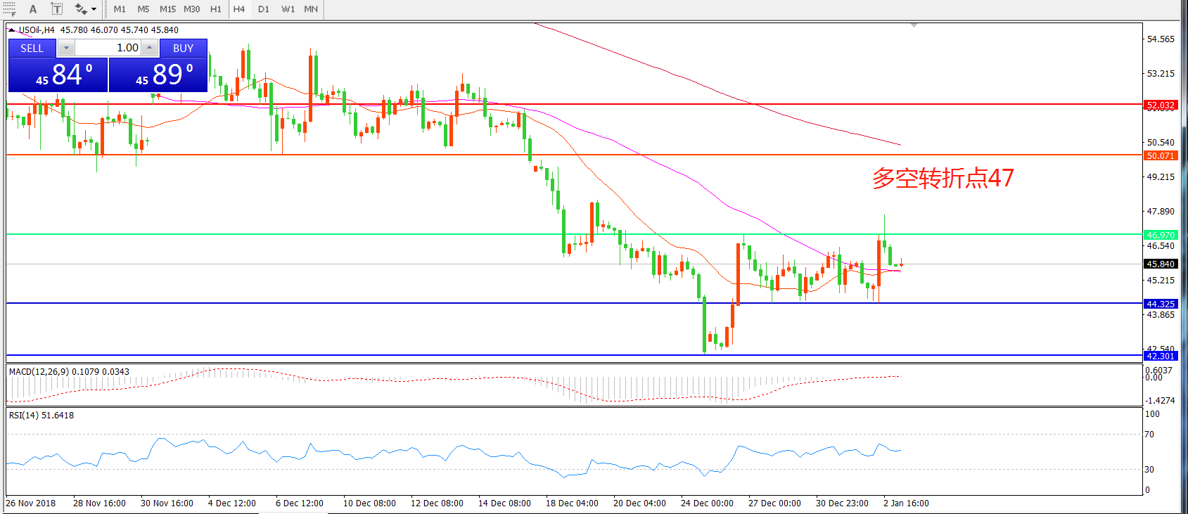 4时图看,油价经过连续测试,初步站稳44美金一线支撑,21与55均线逐渐粘合形成支撑,MACD绿柱缩短,短期反弹成为可能,窄幅震荡的走势的概率较大。