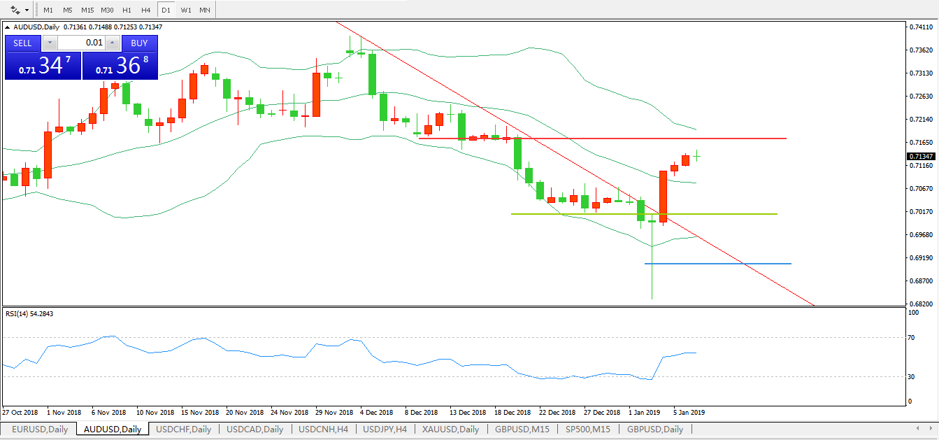 技术面简析:布林带开口开始拐头价格升穿布林中轨,RSI拐头向上攻击,下降趋势线被击破,预计短期汇价将延续上行态势
