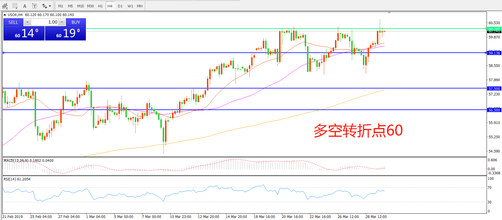4小时图看,油价以均线系统为依托,不断上行,再次冲击前高60美金一线,短期走势偏强。MACD红柱增加,RSI指标走平,重点关注上方60美金阻力,一旦突破将开启新一轮的上涨趋势。