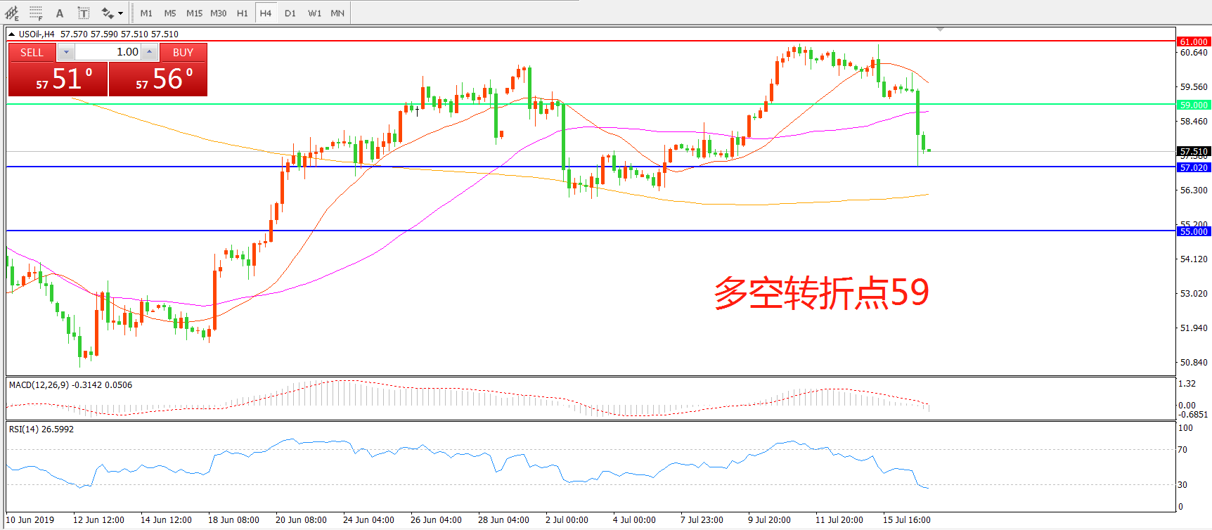 4小时图看,油价长阴破位,无力收复,短期走势偏弱,57美金成为短线支撑,短期均线出现拐头, MACD绿柱增加, RSI指标拐头走平,日内延续下行概率较大,重点关注晚间EIA库存数据表现。