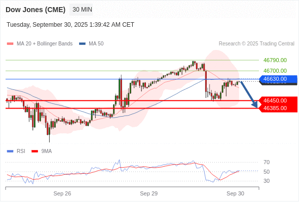 在 46630.00 之下,看跌,目标价位为 46450.00 ,然后为 46385.00 。
