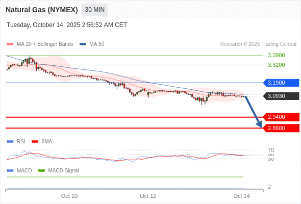 Natural Gas (NYMEX) (NOV5) 当日内: 看跌,当 3.1900 为阻力位。