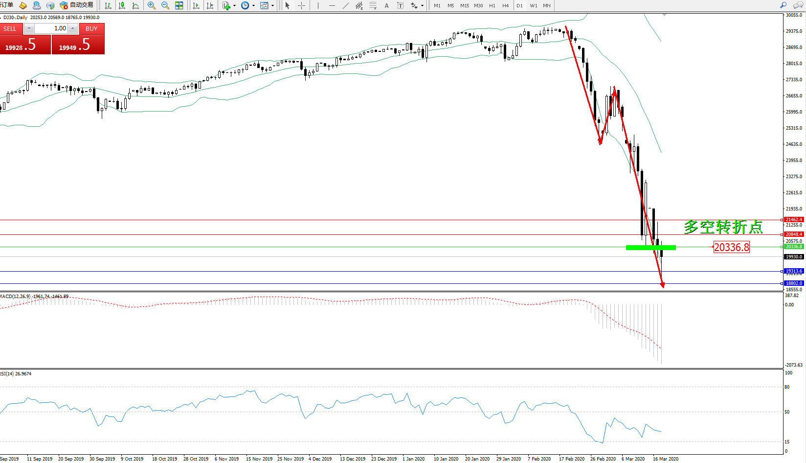 道琼斯指数3月18日(周三)收盘下跌1334.90点,跌幅6.29%,报19902.52点。美股今日再次暴跌,道指开跌约1200点,触发熔断,全市场暂停交易15分钟,恢复交易后道指继续下行,失守19000点,较2月高点跌超万点,但尾盘拉升,越来越多的迹象表明全球经济受到疫情的破坏,投资者对风险较高资产的兴趣依然疲弱;美元指数跳升至近三年高位,特朗普政府周三要求国会批准5000亿美元的拨款,用来派发给纳税人,4月6日起分两轮发放。