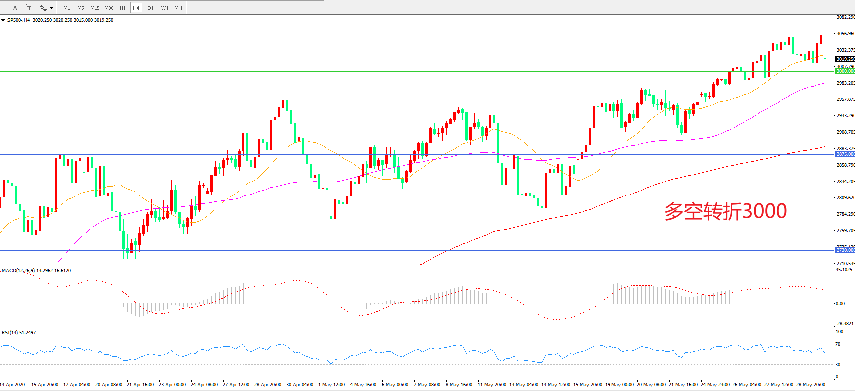 4小时图看,标普500上演V型反转,3000点成为下方有利支撑,均线系统呈多头排列,MACD红柱增加,RSI指标走平,日内延续上行概率较大。