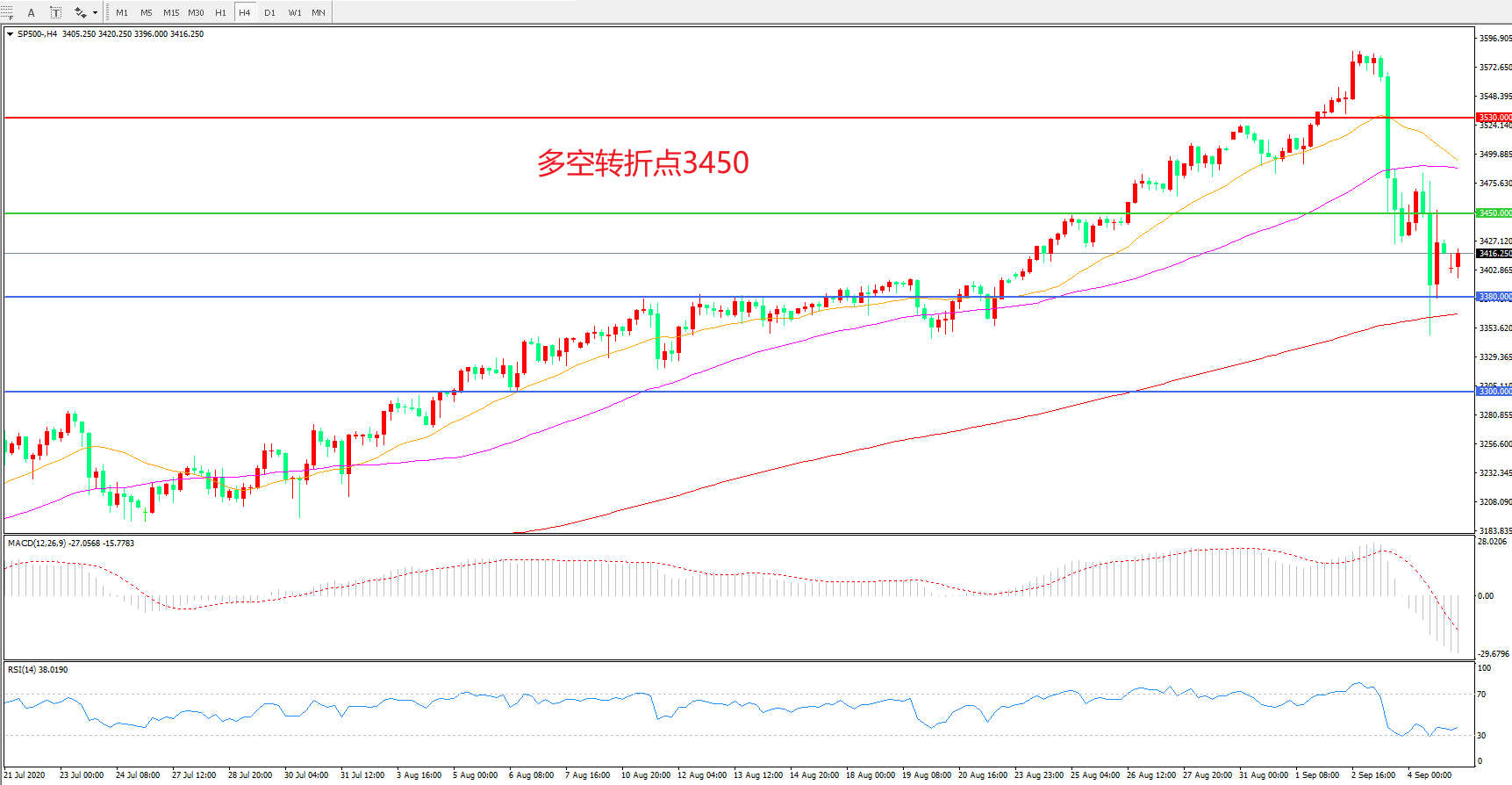 上周五(9月4日),美股上演深V反转走势,三大股指小幅高开后快速回落,五大科技巨头较近期高点回调10%以上,但此后美股突现大逆转,标普500短暂翻红,最终小幅收跌,报3417.50点,创三月美股闪崩以来最大单周跌幅。