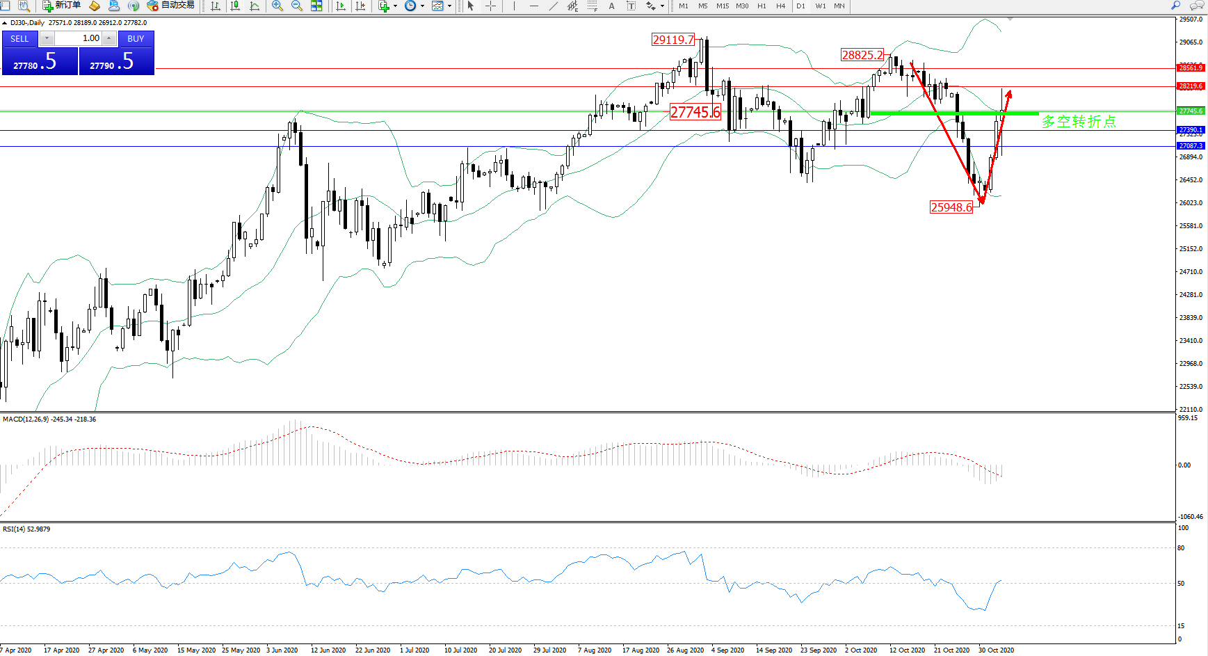 技术点评:高位呈M形态震荡延续布林带指标下轨附近弱势下行,抵达25948附近后得到支撑开始强势反转强势拉升上扬,突破布林带指标中轨后有继续上扬态势,布林带指标呈收口走势中,MACD指标处于0轴线下方空头区域弱势徘徊中,RSI指标处于空头区域弱势整理后开始反转强势拉升,即将触及50均衡线附近节点;