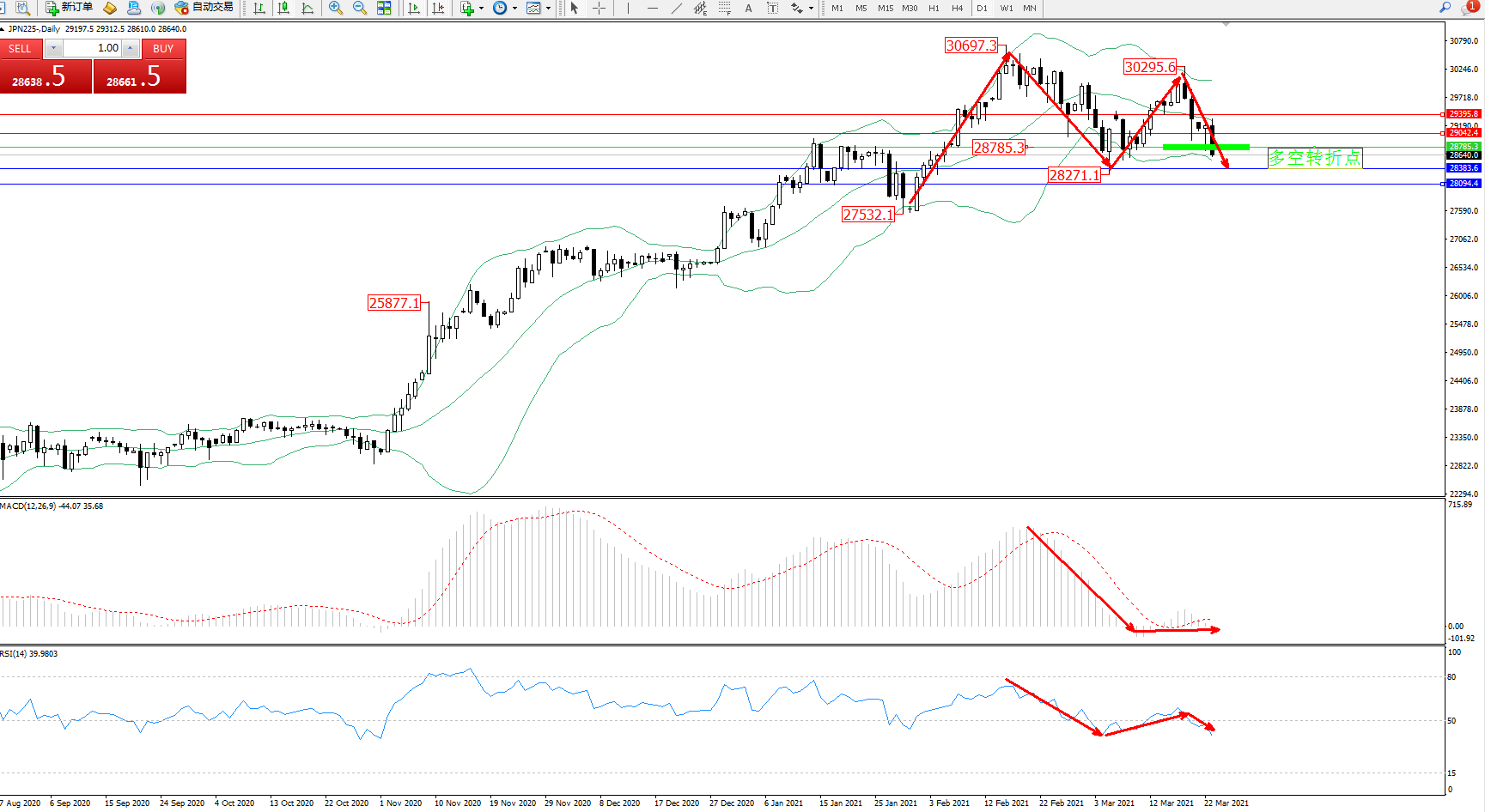 日经225指数3月23日(周二) 收盘下跌150.65点,跌幅0.52%,报29023.50点。在日本央行结束对日经225指数的支持之前,将有一段宽限期。日本央行一位发言人称,日本央行停止购买跟踪日经225指数的ETF,计划要到下月初才能生效。这是为了让日本央行和它雇佣的银行为调整后的购买计划做必要的准备。据《日经新闻》报道,日本央行周一继续买入与日经225 (Nikkei 225)和JPX日经400 (JPX Nikkei 400)相关的ETF。日本央行的这一举动一度令交易员感到困惑。上周,日本央行出人意料地决定今后只购买与东证证券挂钩的ETF。日本东京新增337例新冠肺炎确诊病例。日本央行已经承诺将继续维持ETF收购力度,这足以继续提供充足的流动性来为股市保驾护航,同时,日本金融市场面对债市收益率的上行也相比其他市场更有耐受力,因而在经济终将趋于复苏的大背景下,日股的继续上行也是不在话下。