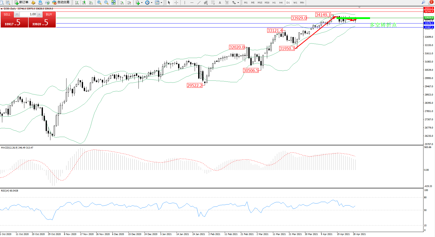 道琼斯指数4月29日(周四)收盘上涨241.10点,涨幅0.71%,报34061.48点;美股收盘,三大股指集体收涨,美国总统拜登提出数万亿美元的新支出计划,且数据显示美国第一季经济成长加速;美国商务部经济分析局:2021年第一季度,美国实际国内生产总值以年率6.4%的速度增长,反映了经济持续复苏、企业重新开业以及政府继续应对新冠肺炎疫情的成效。今年第一季度,通过《新冠肺炎应对和救济补充拨款法案》和《美国救援计划法案》,向家庭和企业发放了直接经济影响支付、扩大的失业救济和工资保障计划贷款等政府援助款项。第一季度实际GDP的增长反映了个人消费支出(PCE)、非住宅固定投资、联邦政府支出、住宅固定投资以及州和地方政府支出的增长,这些支出被私人库存投资和出口的减少部分抵消。