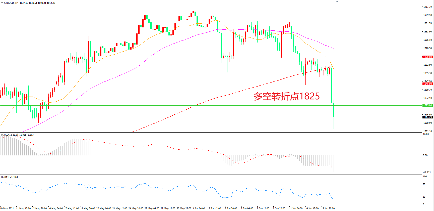 周三(6月16日),美联储暗示,加息会比此前预期来得早,缩减QE的阴影再次笼罩,美元和美债收益率跳涨,现货黄金闻讯暴跌,收报1810.79美元/盎司,日内狂泻逾60美元。短期内美元将受益于更加鹰派的加息路径,,美联储决策者预期加息次数增多可能会推升实际利率,美元指数走强将导致金价出现更大幅度的下跌。