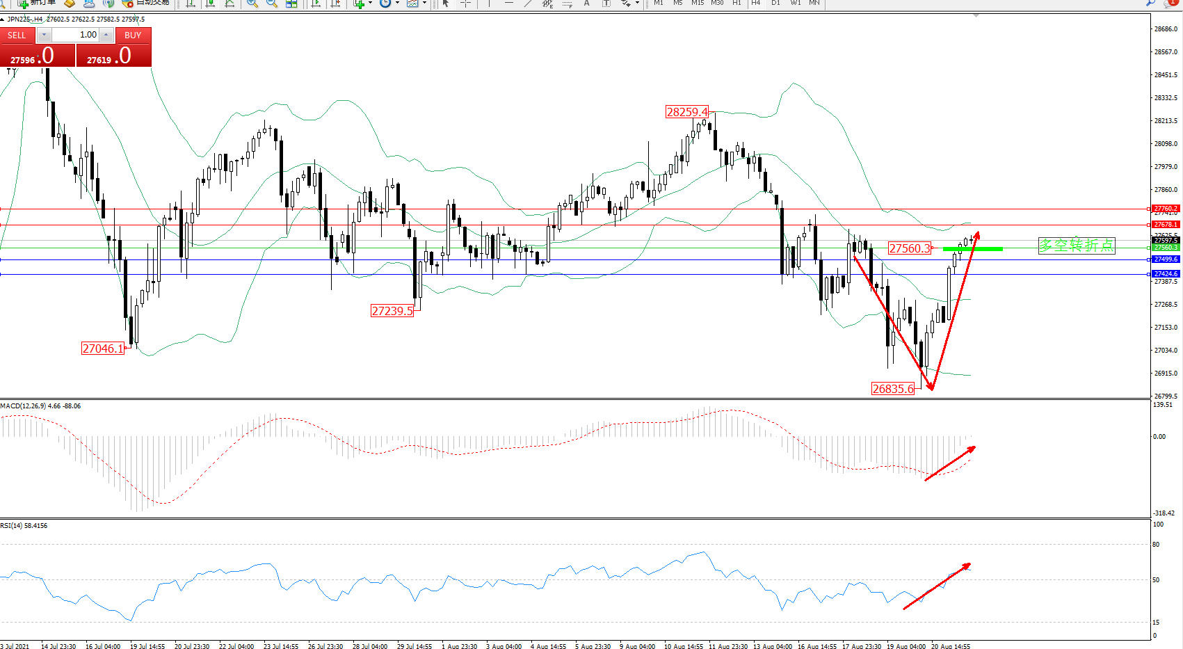 技术点评:空头动力延续布林带指标通道中下轨区间持续震荡下行,低位抵达26835位置后呈V型反转强势拉升向上移动,突破中轨即将触及布林带指标上轨附近节点,多头动力有继续向上移动迹象,布林带指标呈缓慢张口走势中,MACD指标处于空头区域低位震荡向上移动中,RSI指标处于空头区域持续震荡向上拉升至50均衡线上方徘徊中;