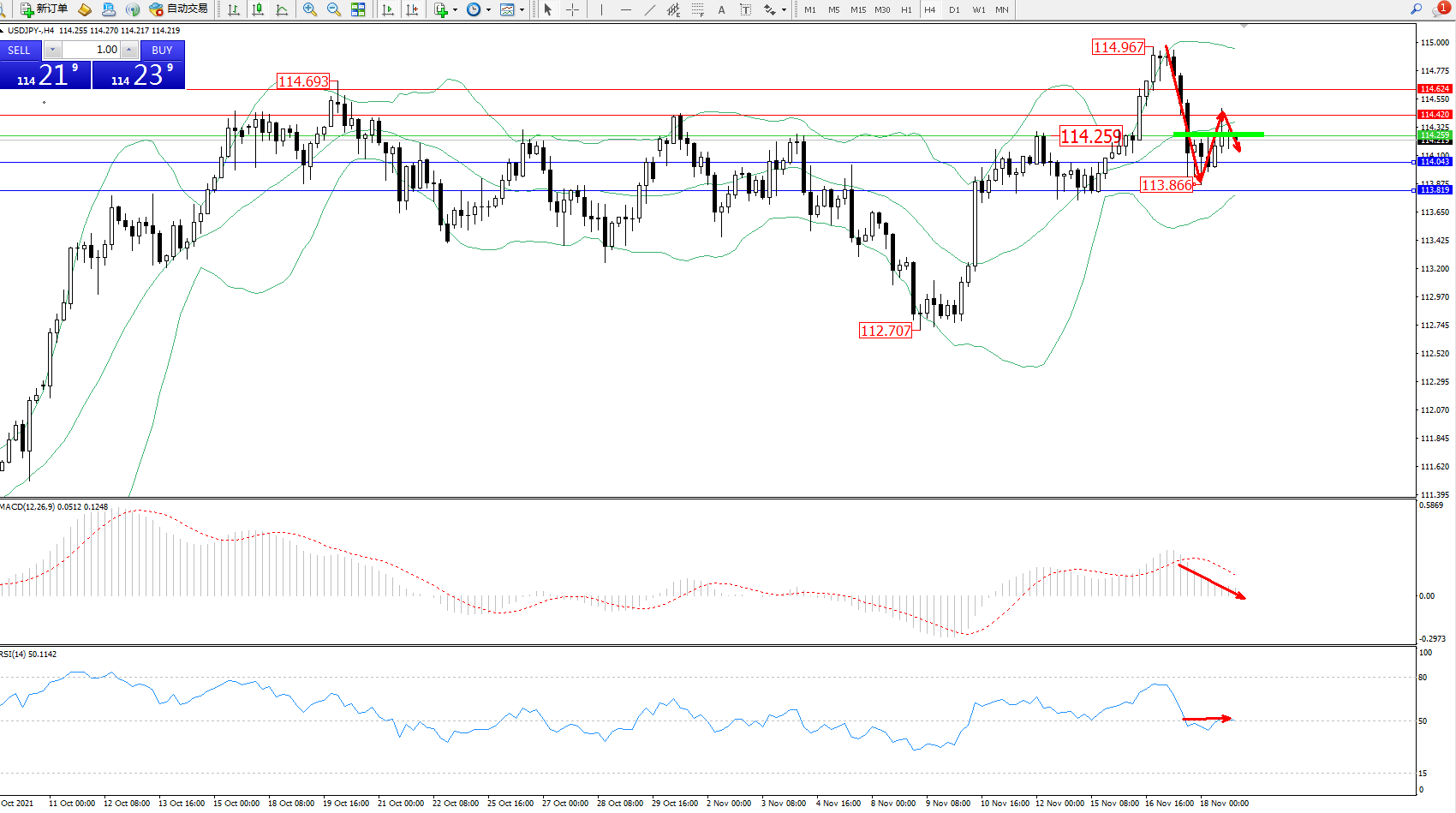 技术点评:多头动力延续布林带指标通道内持续款震荡向上移动,高位抵达114.967位置后遇阻,开始急速回撤下行,纠结于布林带指标中下轨区间弱势整理,短期多头动力仍有上移迹象,但终究未能突破中轨附近节点,布林带指标呈上行趋势走势后开始有收口迹象,MACD指标处于多头区域维持整理回撤下行后开始徘徊,RSI指标处于50均衡线附近弱势整理中;