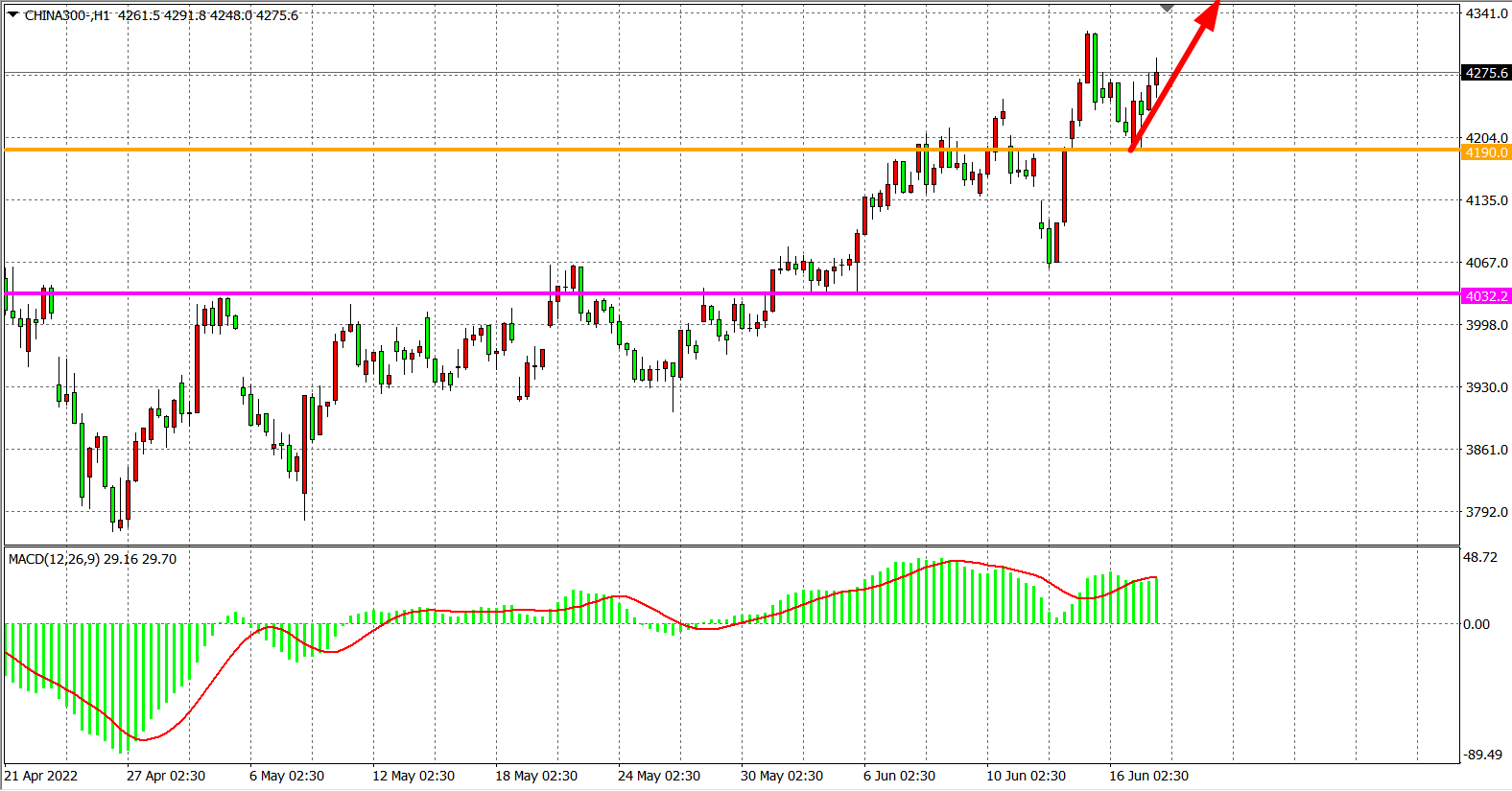 1小时图看,沪深300指数上破4190后,阻力已转化为支撑,当前再度回踩4190企稳延续涨势,MACD在零轴之上开始重新放量,日内在4190之上继续看涨,目标4320-4450
