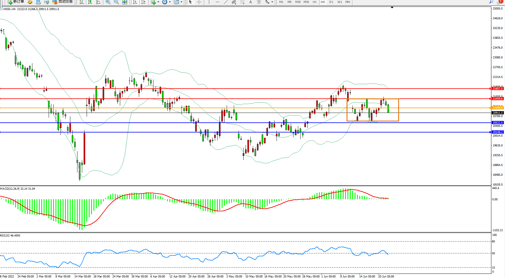 香港恒生指数6月22日(周三)收盘下跌551.25点,跌幅2.56%,报21008.34点;港股主要指数全天呈单边下跌行情,且午后跌幅进一步扩大,恒生科技指数大跌4.37%,再度失守4600点,隔夜美股中概股走强未能带动港股科技股上涨,京东跌超6%,快手、美团、阿里巴巴均跌超4%,在线教育股再度拉升,新东方在线涨超10%。