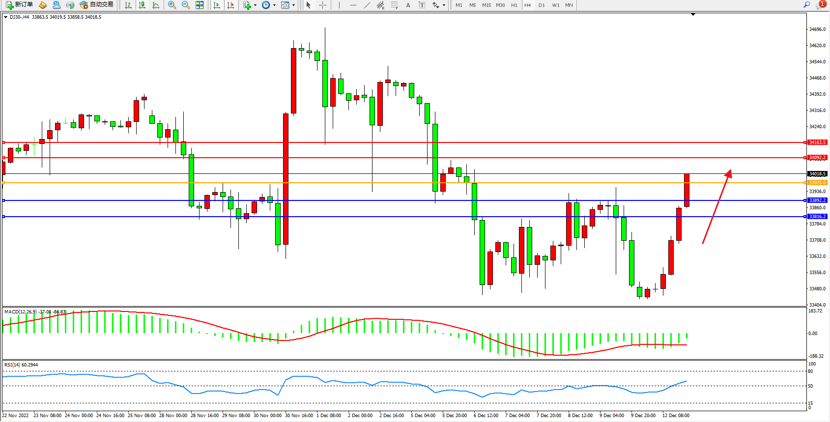 道琼斯指数12月12日(周一)收盘上涨528.58点,涨幅1.58%,报34005.04点;市场预计FOMC将在12月议息会议上加息50个基点,将联邦基金利率的目标区间提高到4.25%-4.50%。这样做,委员会将最终把经通胀调整的政策立场转换到限制性领域。预计FOMC会发出信号暗示,终端利率恐将比9月预期更高。