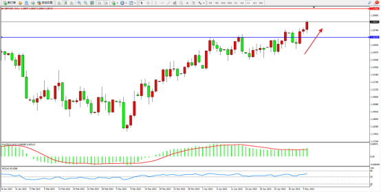 高位多头动力维持震荡向上移动,短期看涨情绪依旧,市场多头不断攀升中,上方压制关注1.27405附近,低位支撑关注1.25219附近,MACD指标处于多头区域整理平移,RSI指标处于50均衡线上侧缓慢上行,如图: