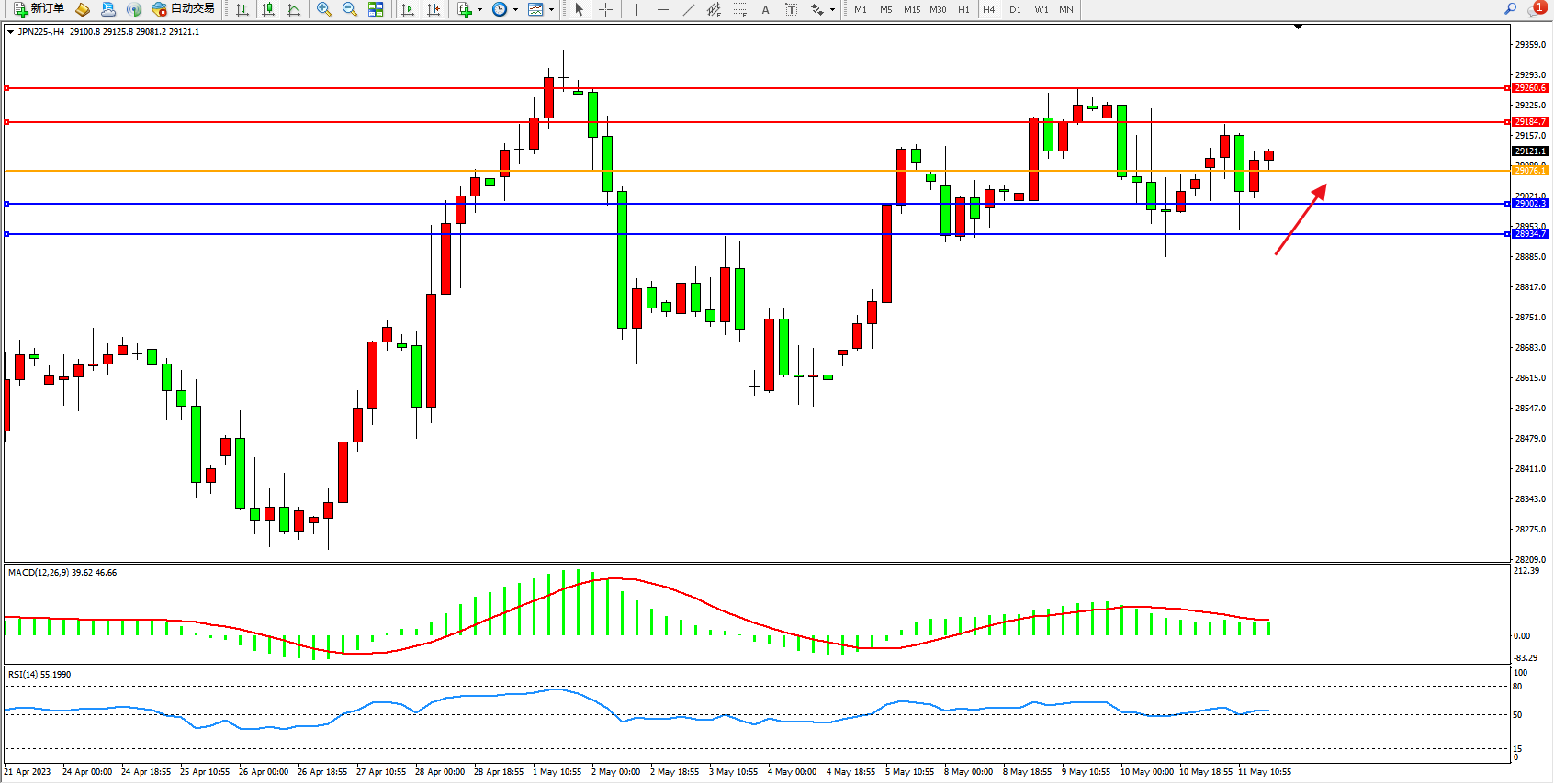 日经225指数5月11日(周四)收盘下跌0.18点,跌幅0.00%,报29122.00点。日本央行公布4月政策会议意见摘要显示,日本央行决策者在新任总裁植田和男上任后的首次会议上就该国实现通胀目标的进展以及他们可能缩减刺激举措的速度进行了讨论。