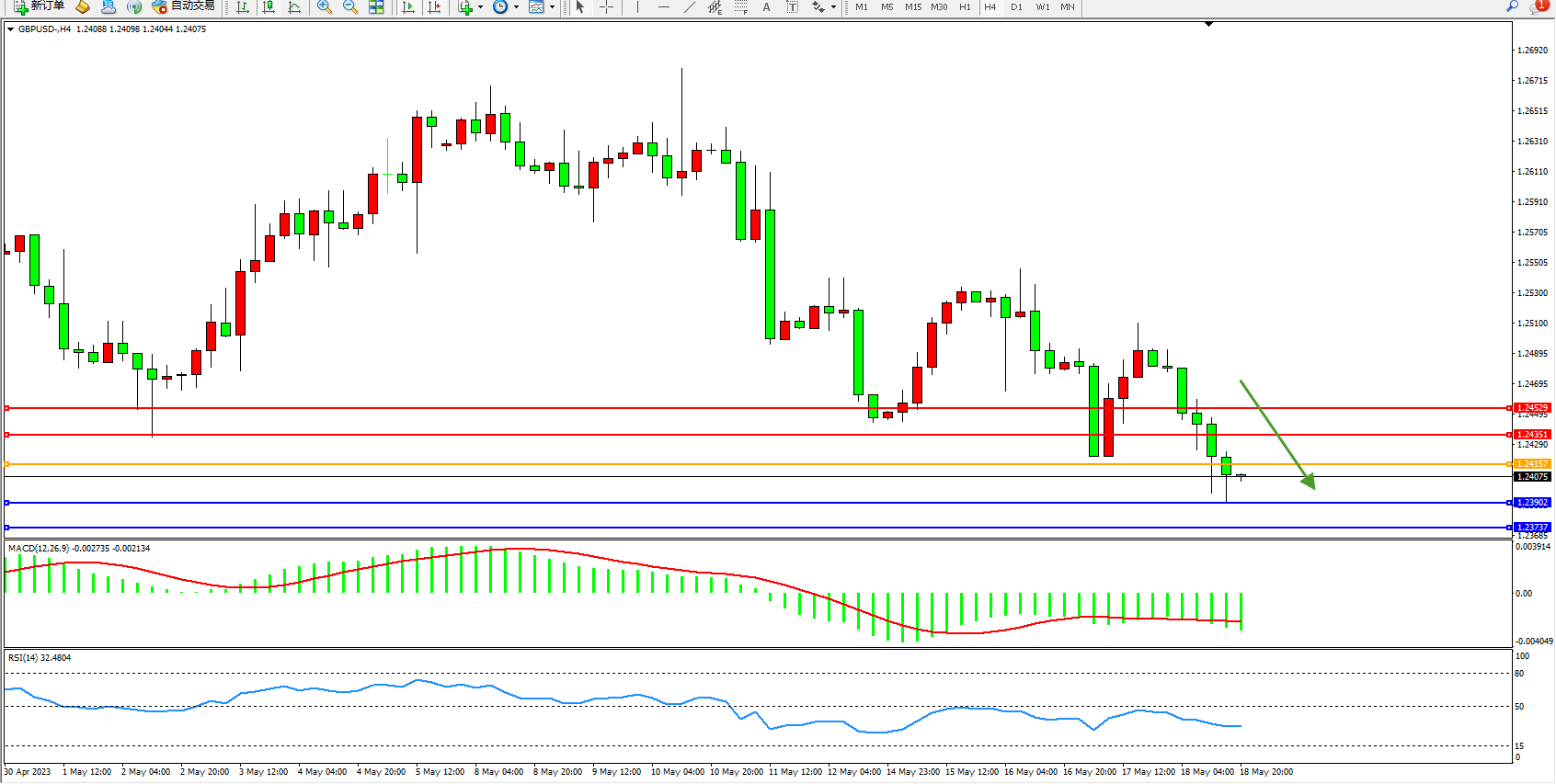 交易策略:1.24157下方看跌,目标1.23902 1.23737